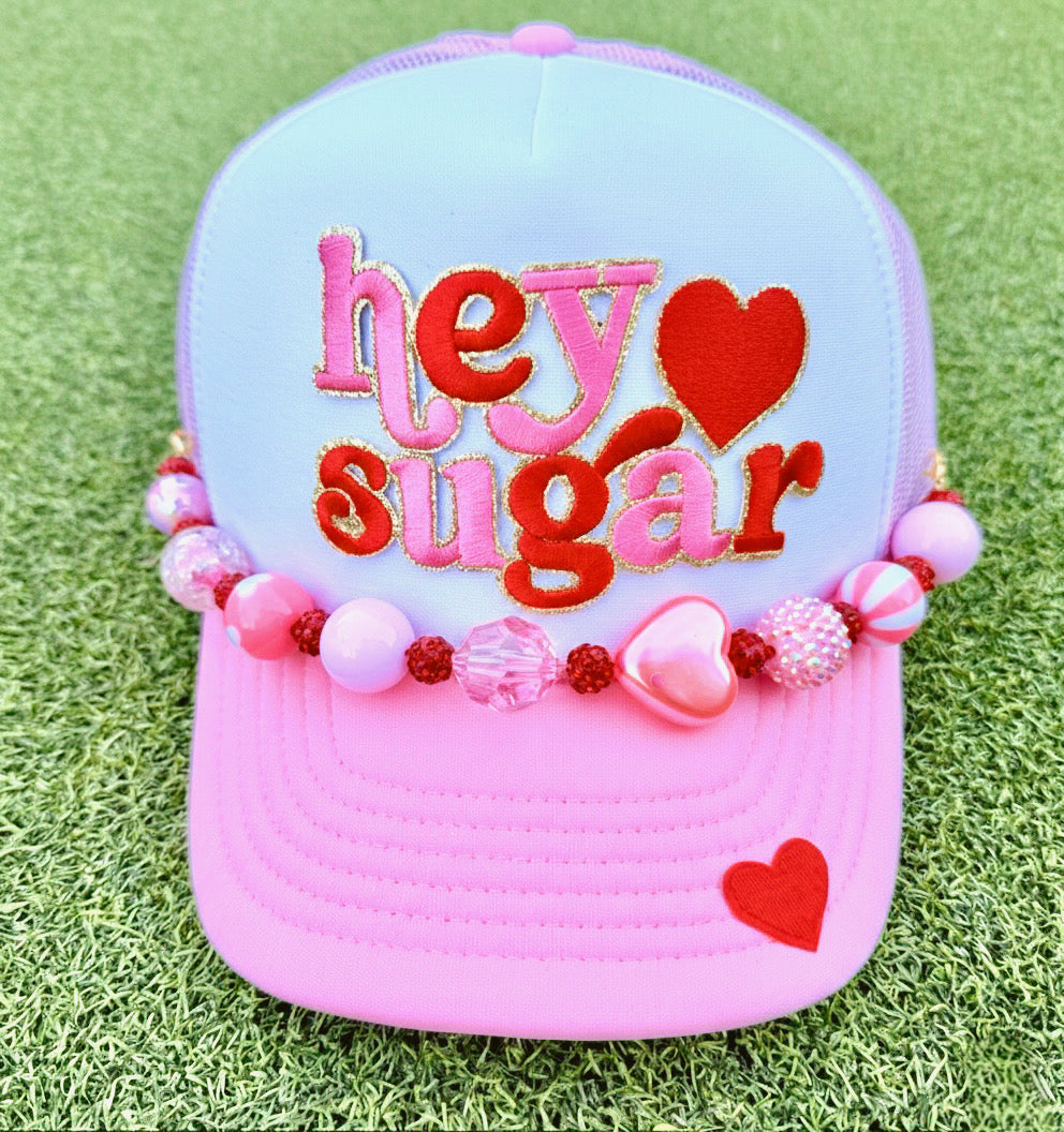 ONE OF A KIND! Glitter outlined Hey Sugar trucker hat in pink and white with oversized acrylic beads. This one is sure to give you a candy rush!