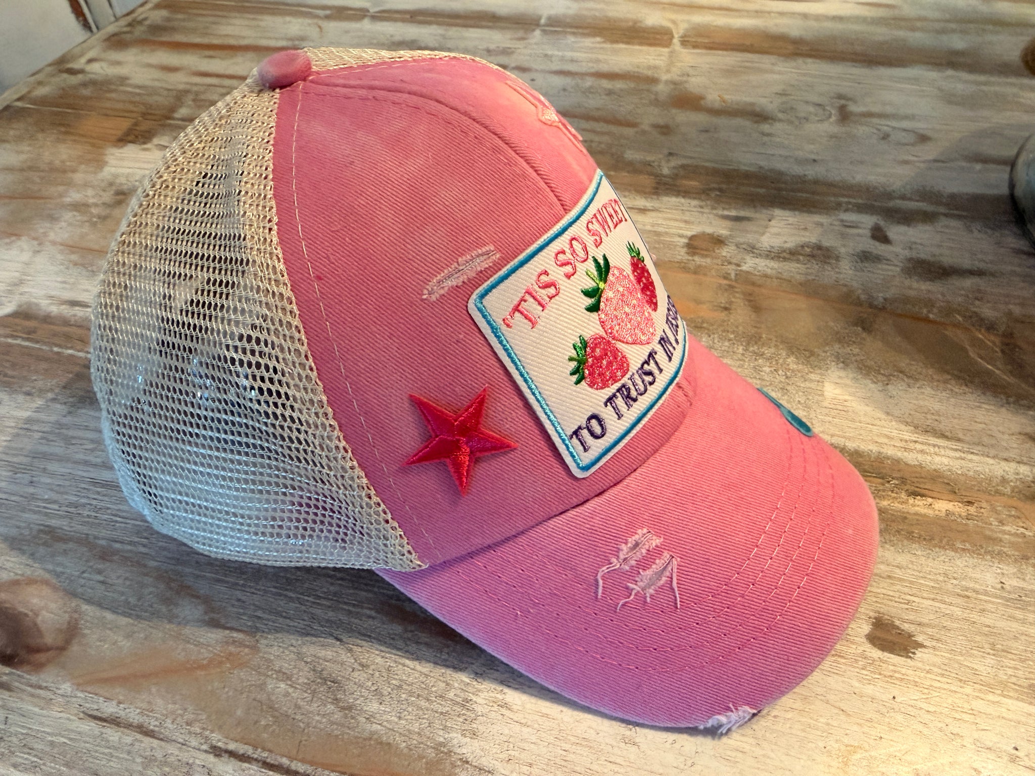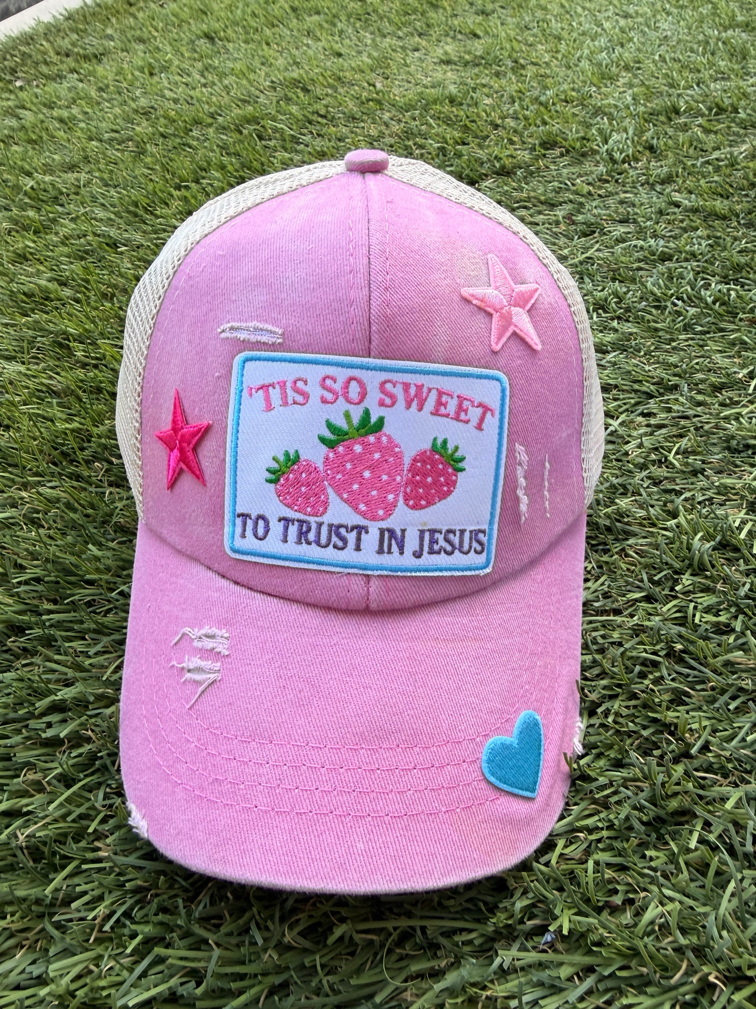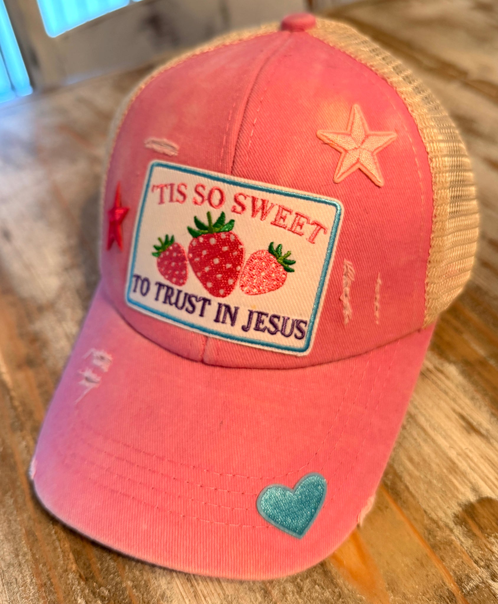 ‘‘Tis so sweet to trust in Jesus” youth ponytail hat. Pink, stars, strawberries and hearts scream super adorable little girls!