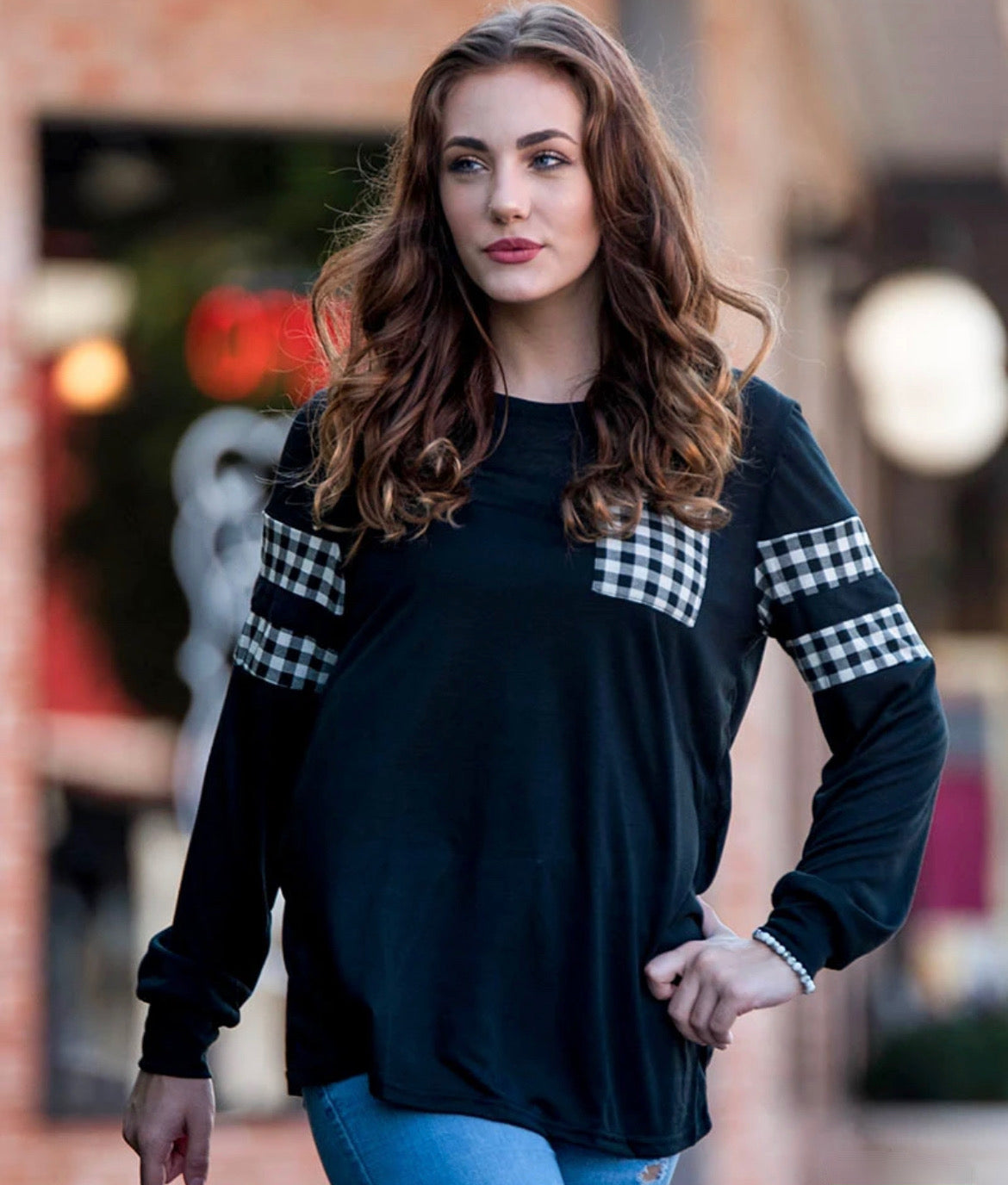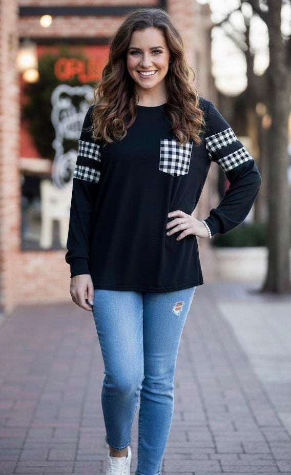 Oh sooo soft black and white gingham banded sleeves with matching pocket make this long sleeve tee a must have! Lightweight and perfect for pairing with a vest and jeans!