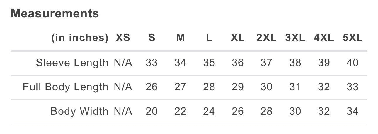 (in inches) S M L XL 2XL 3XL 4XL 5XL