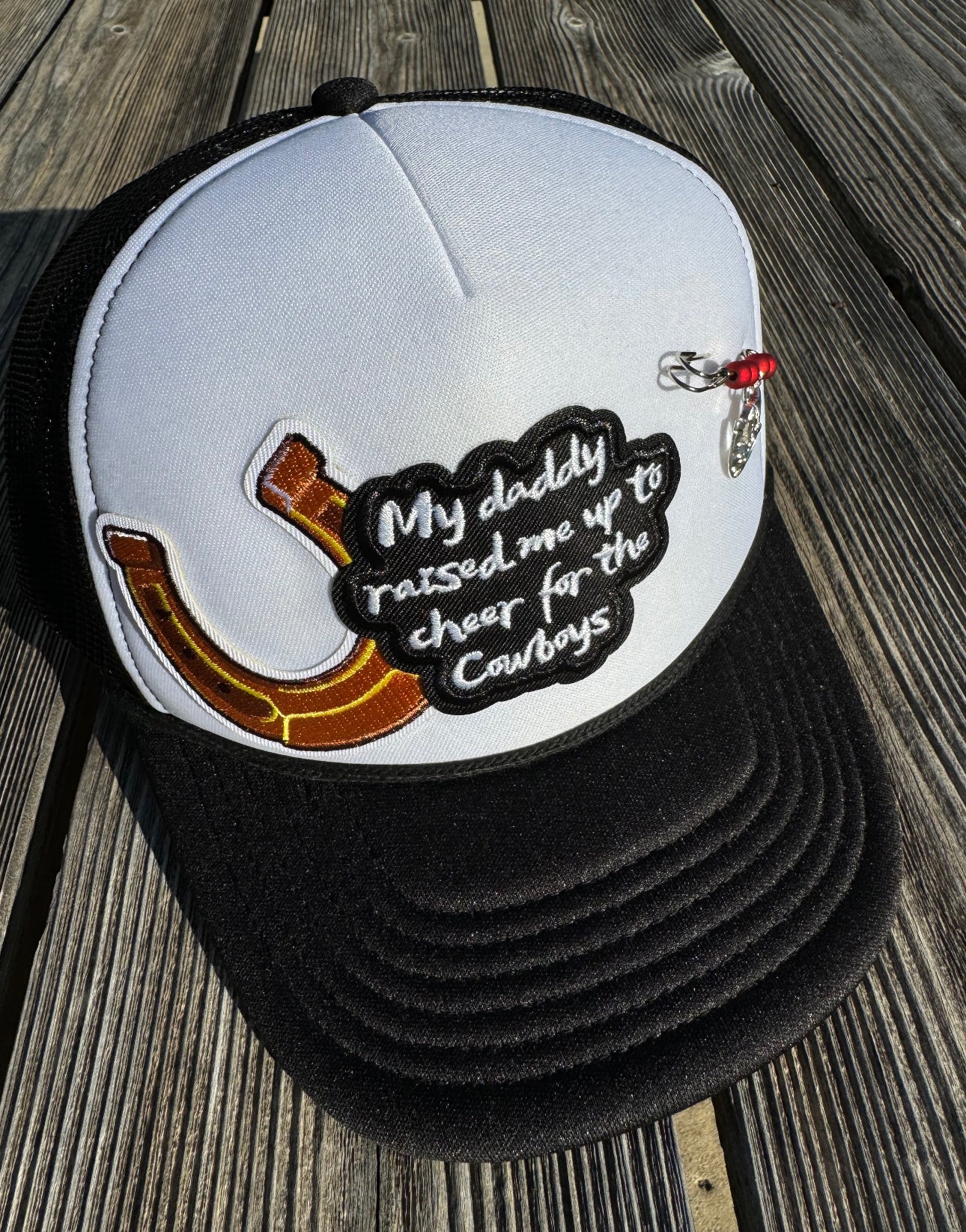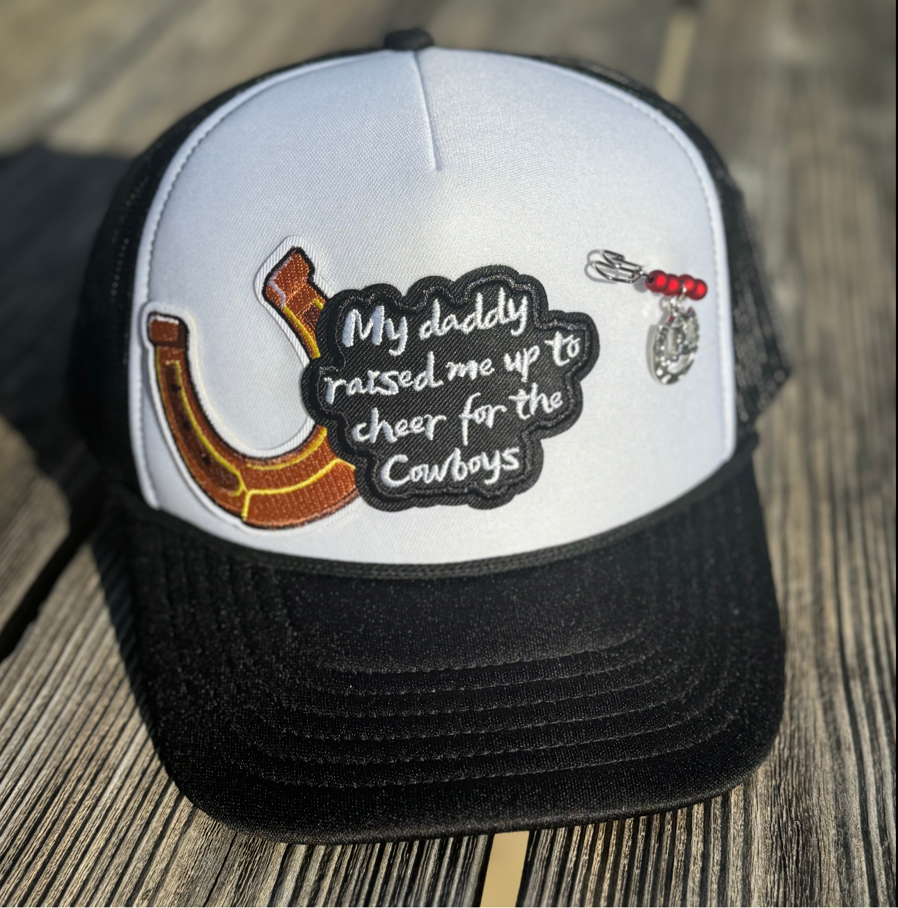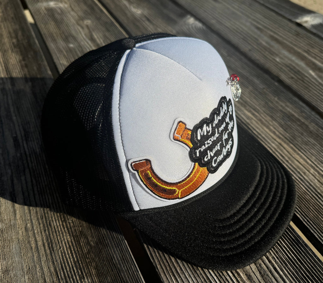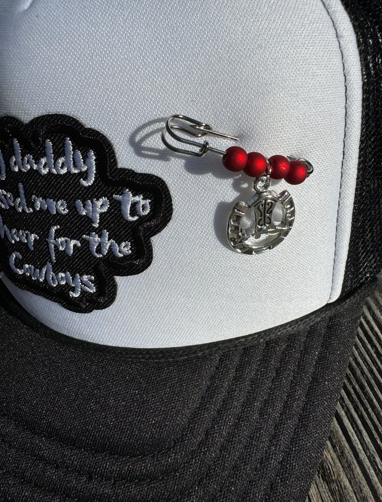 One of a kind Cowboys themed trucker hat with a cute added silver pin with red beads and silver horseshoe.