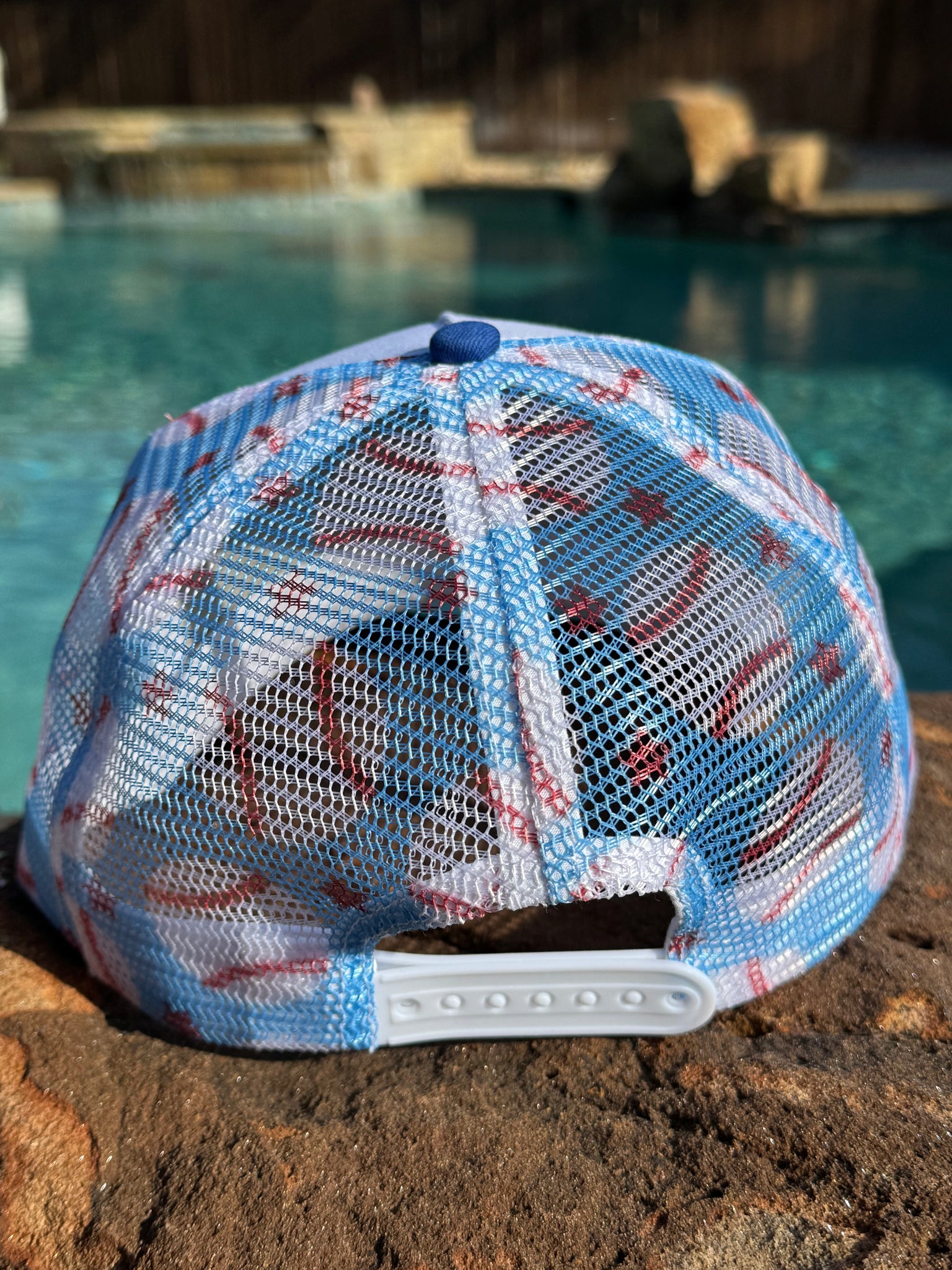 A classic phrase for a classic game! Baseball printed mesh with a super cute embroidered patch.
