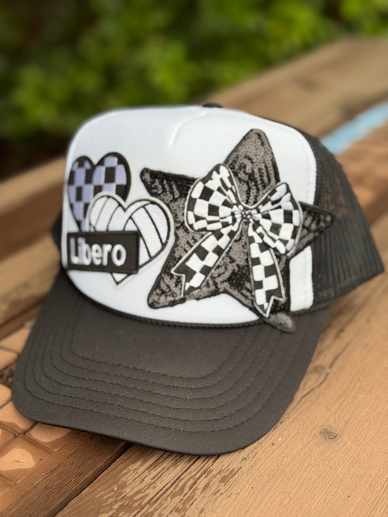 Super cute and One-Of-A-Kind LIBERO patched volleyball cap in classic black and white. Perfect for game day!