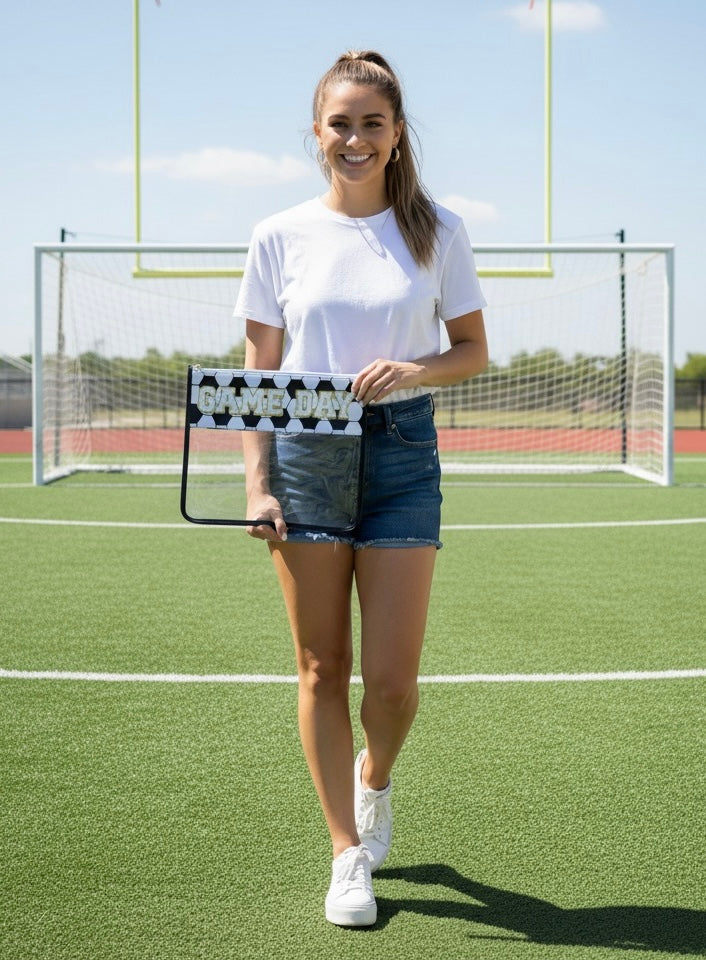 Show them what you’re working with! These clear tote bags with STUFF written in chenille patched letters are all the rage.