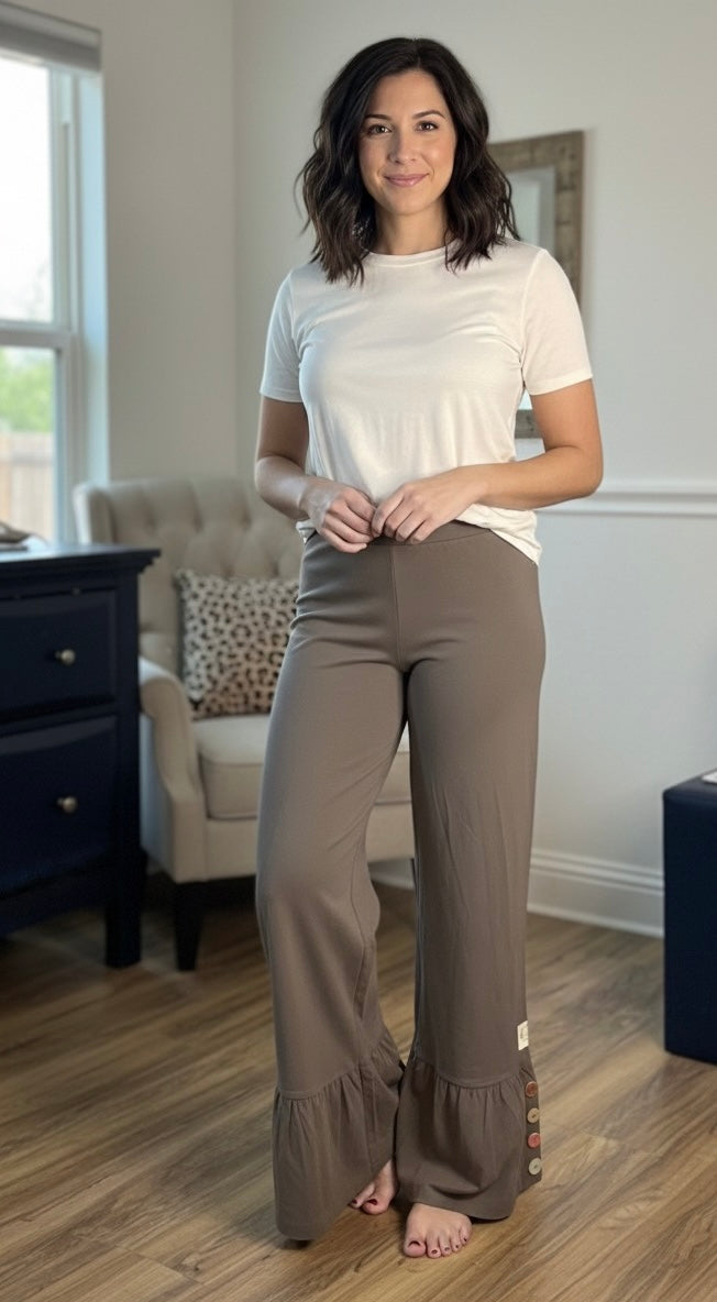 These boho-styled pants with a yoga feel are the perfect choice for a day at work, a night out, or a more casual family gathering. Elastic waist with some “give.” The whimsical buttons along the flared leg are fun and add a pop of color to the bottoms.